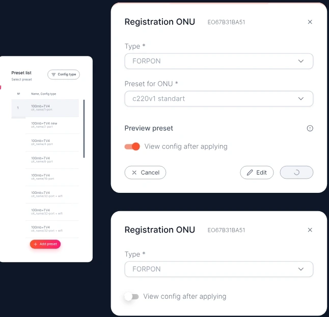 The slot, the card and the number are determined automatically, but anyway it is possible to select the needed ONU number. - It is also possible to configure the ONU after the registration by setting necessary options.